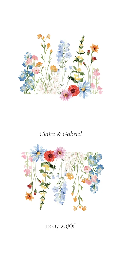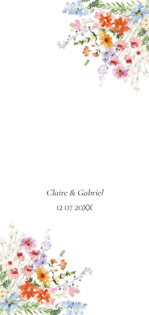 Romantische menukaart bruiloft langwerpig wit met gekleurde bloemen en goudfolie.