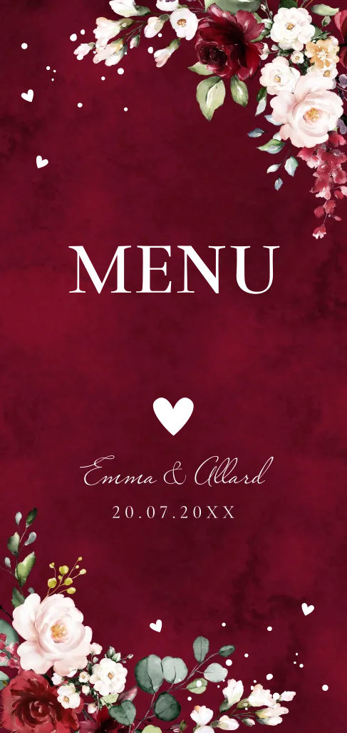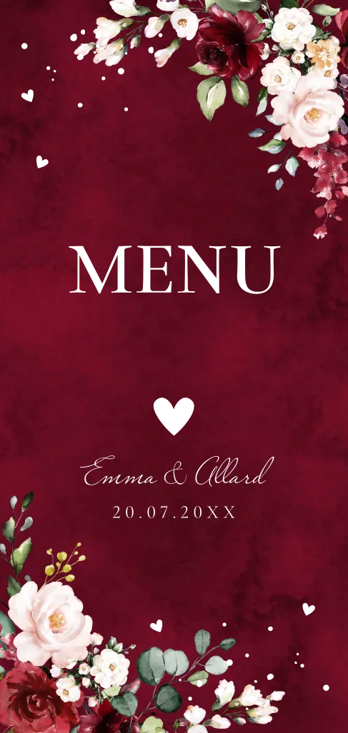 Menukaart bruiloft rood met bloemen en goudfolie.