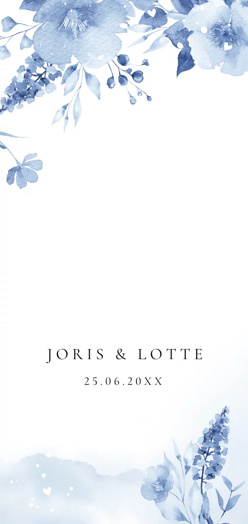 Stijlvolle menukaart huwelijk met bloemen blauw en goudfolie.