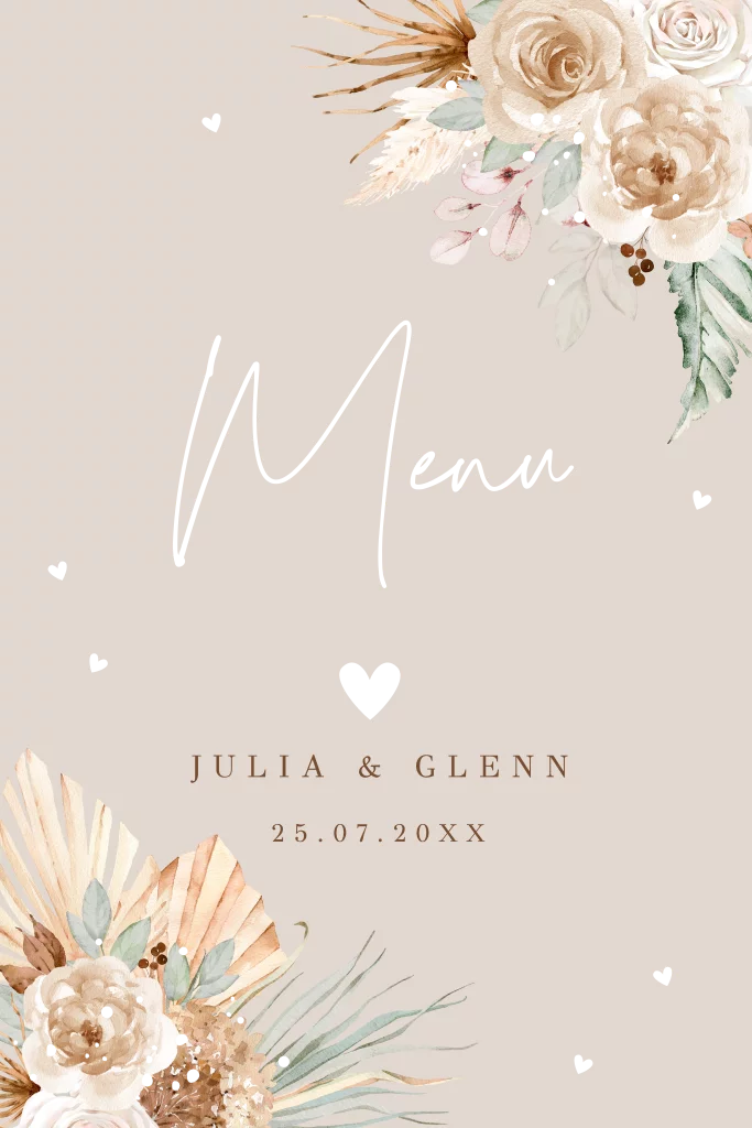 Menukaart huwelijk bohemian bloemen beige goudfolie
