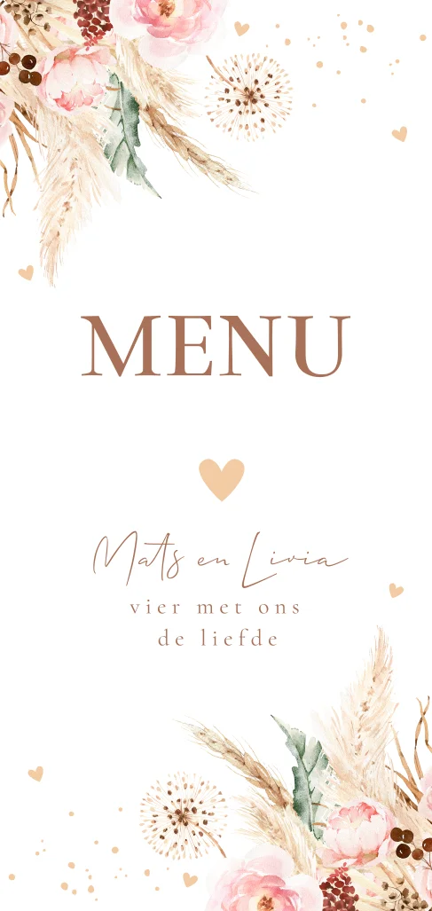 Menukaart huwelijk langwerpig met bohemian boho bloemen.