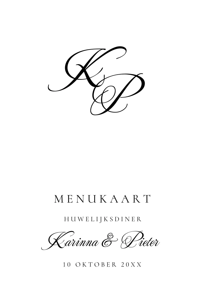 Menukaart huwelijk wit met moderne typografie. Pas de kleuren naar wens aan.