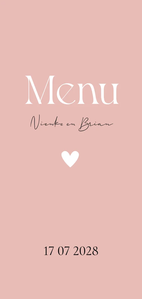 Menukaart huwelijk langwerpig roze met hartje en goudfolie. Pas de kleur van de folie zelf eenvoudig aan.
