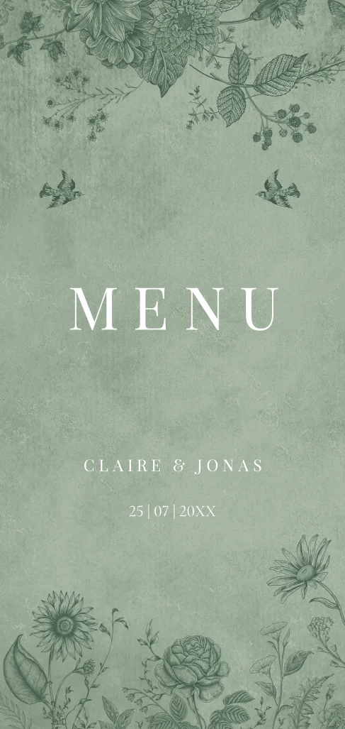 Mooie stijlvolle menukaart groen met botanische bladeren en bloemen.