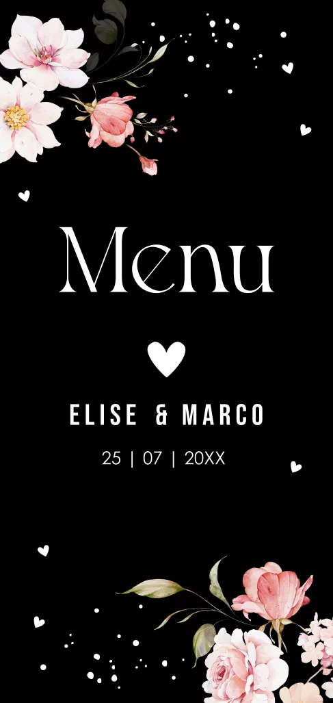 Menukaart huwelijk zwart langwerpig met roze bloemen en rosegoudfolie