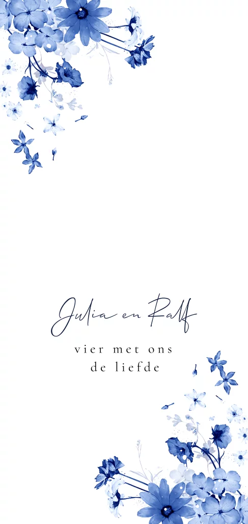 Menukaart huwelijk langwerpig blauw bloemen goudfolie
