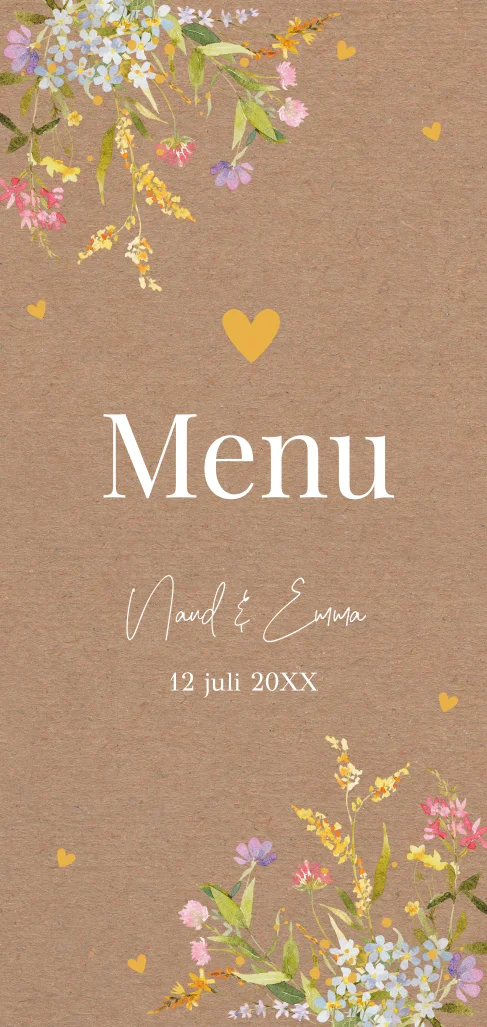 Menukaart huwelijk langwerpig kraftook bloemen zomers geel