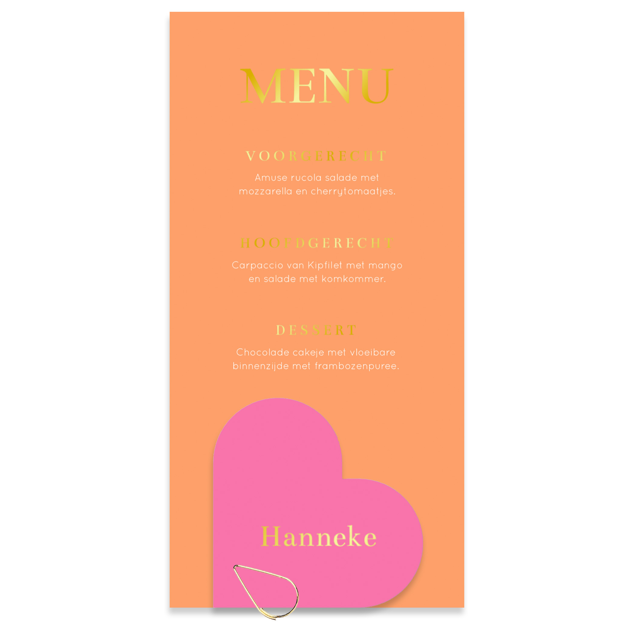 Menukaart huwelijk langwerpig oranje met luxe goudfolie.