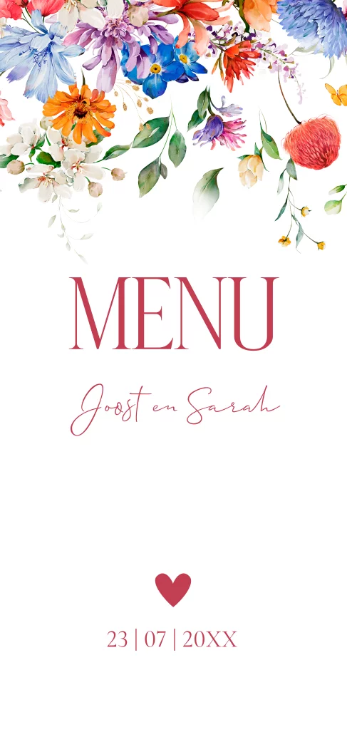 Menukaart huwelijk langwerpig zomerse gekleurde bloemen rood
