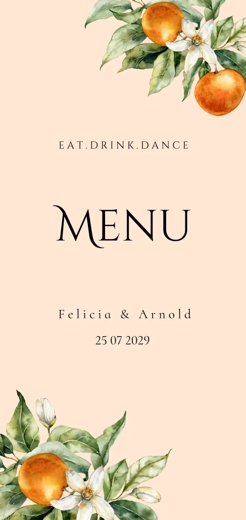 Menukaart bruiloft langwerpig oranje sinaasappels.