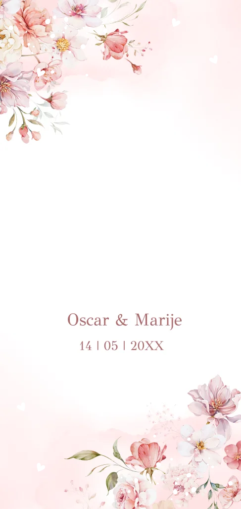 Menukaart langwerpig huwelijk met watercolour bloemen roze en rosegoudfolie.