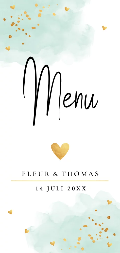 Stijlvolle menukaart huwelijk mintgroen met goudlook confetti. Geen folie!