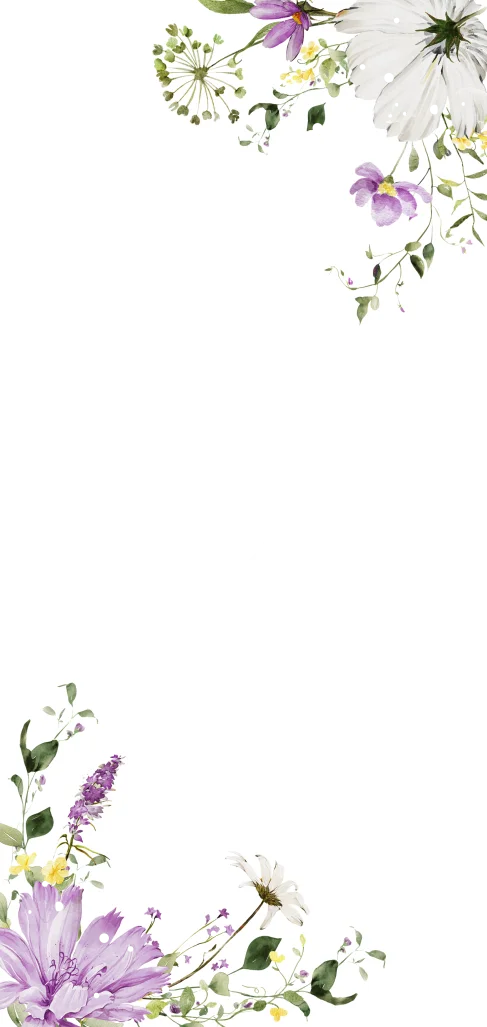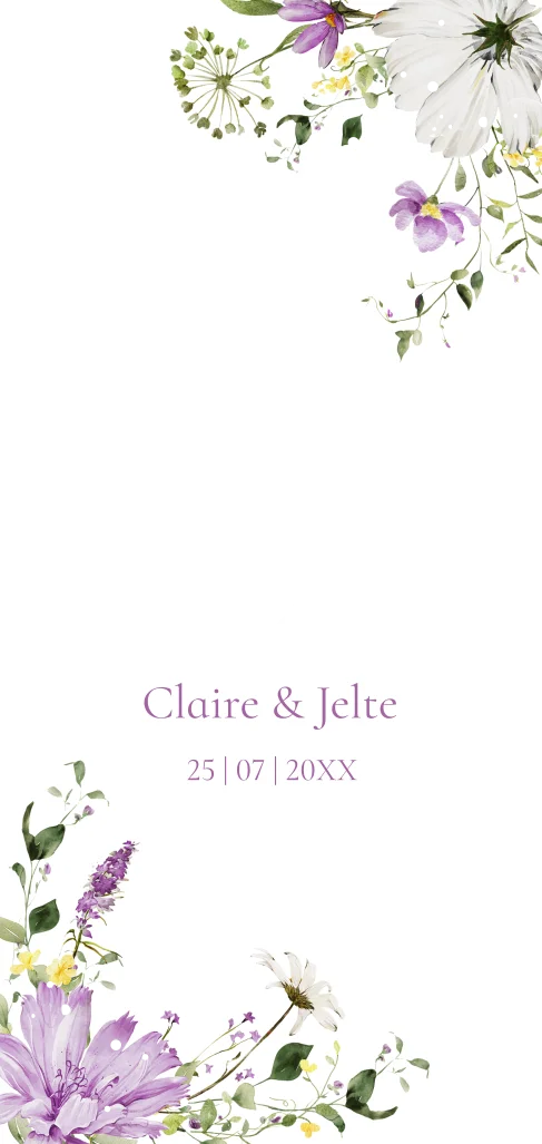 Menukaart huwelijk langwerpig met bloemen paars en goudfolie.