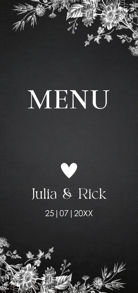 Menukaart huwelijk zwart botanisch bloemen wit goudfolie.