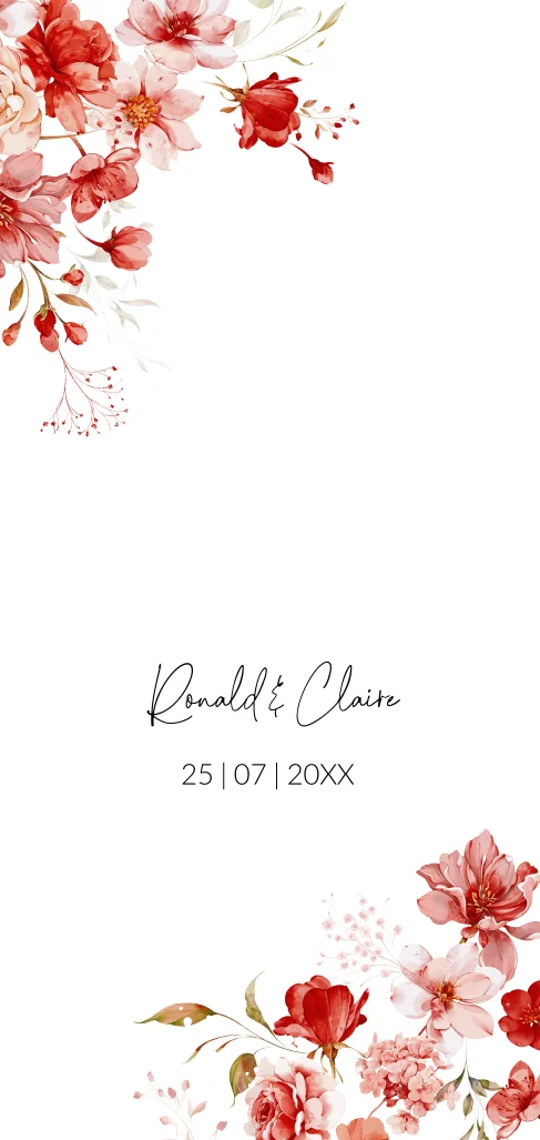 Menukaart langwerpig huwelijk bloemen rood watercolour goudfolie