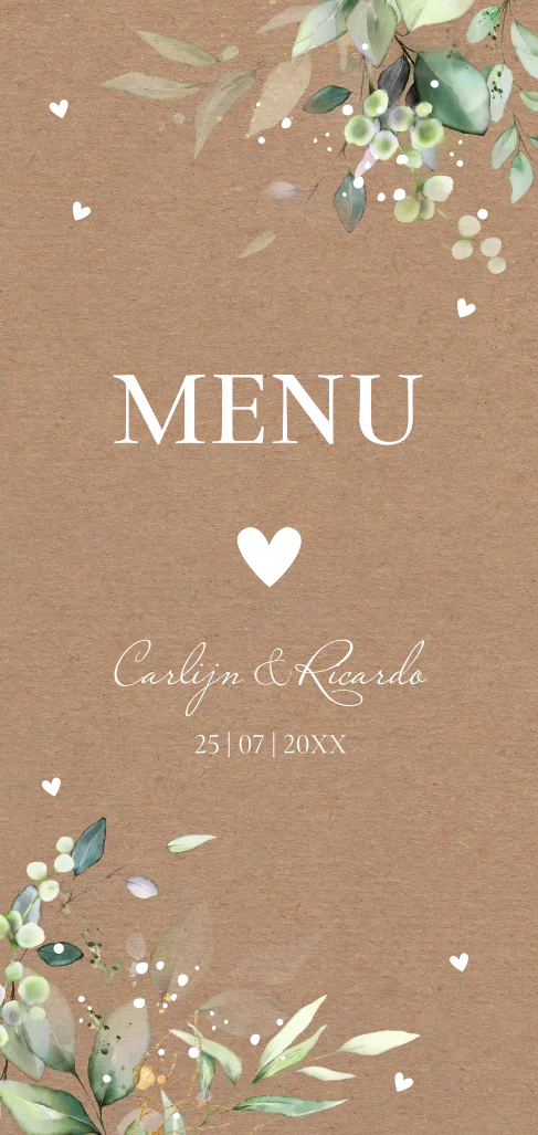 Menukaart langwerpig huwelijk kraftlook botanisch bladeren goudfolie