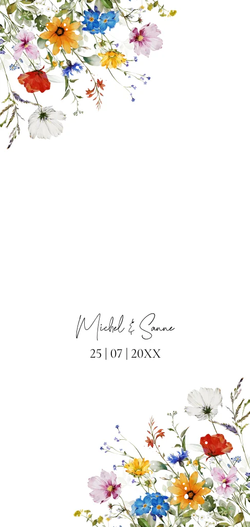 Menukaart langwerpig huwelijk zomerse bloemen en goudfolie.