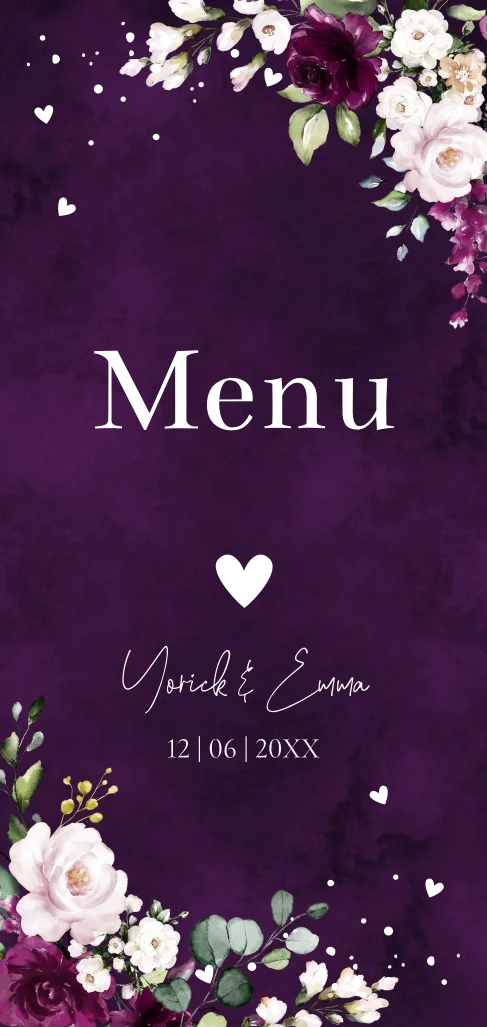 Menukaart langwerpig met paars bloemen en goudfolie.
