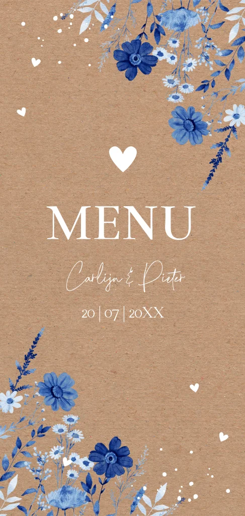 Menukaart huwelijk met watercolour bloemen blauw en kraftlook.