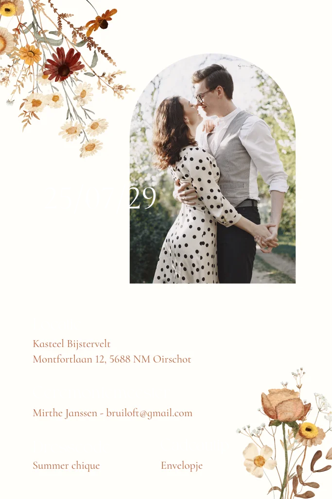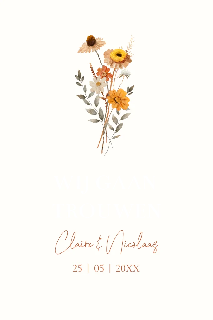 Trouwkaart rechthoekig crème wit met bloemenboeket en goudfolie.