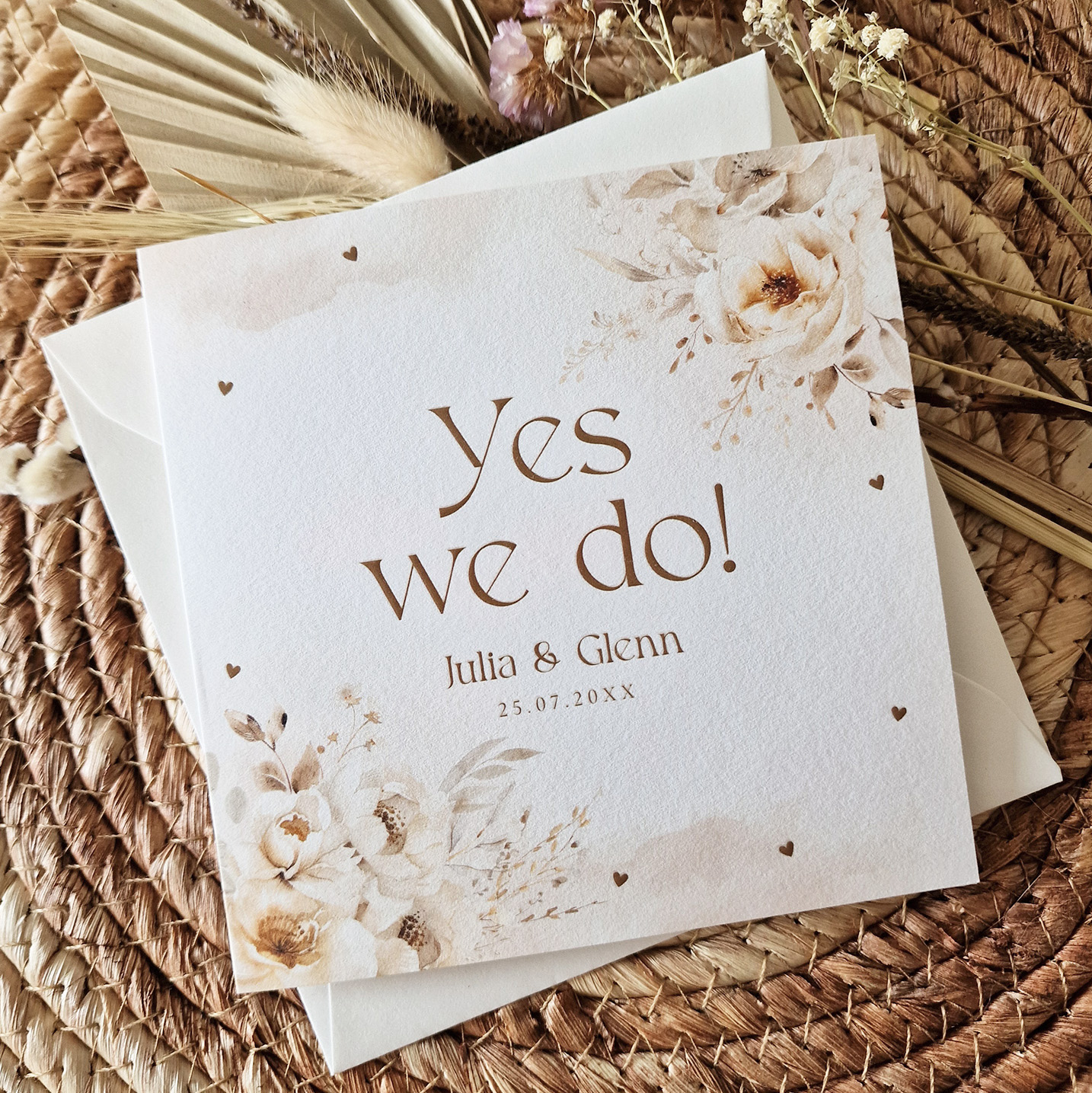 Romantische trouwkaart met beige aquarel bloemen bohemian stijl en hoogglans.