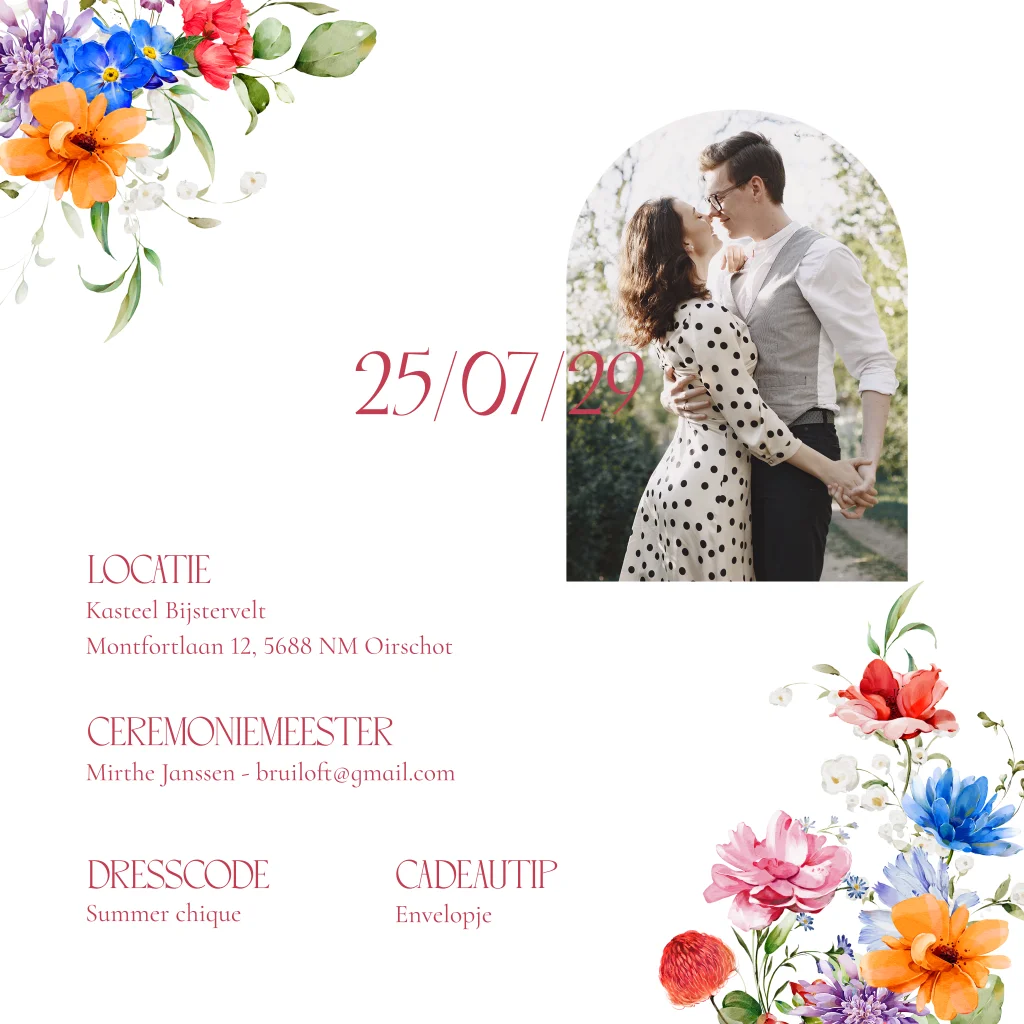 Romantische trouwkaart wit met kleurrijke watercolour bloemenkrans rood, blauw, geel en roze. Nodig jullie gasten in stijl uit met deze trouwkaart met zomerse kleurrijke bloemen.