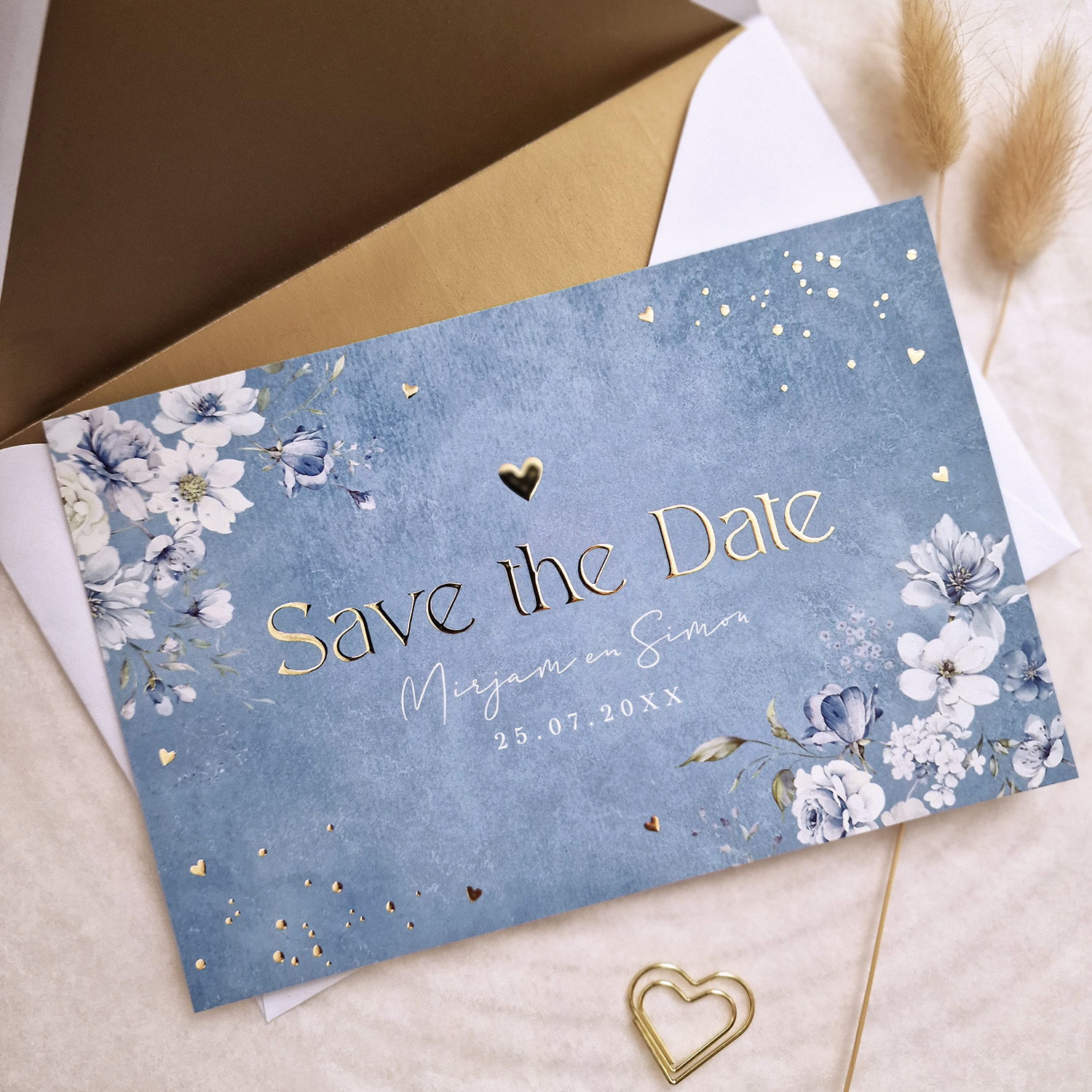 Romantische Save the Date kaart blauw met watercolour bloemen en goudfolie.