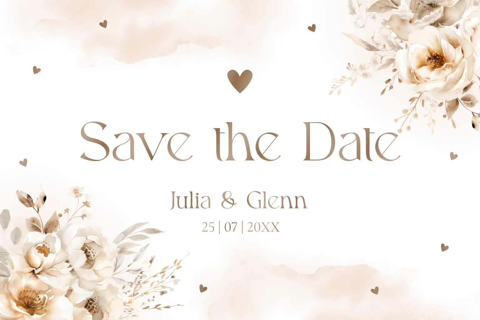 Elegante Save the Date kaart met watercolour bloemen beige en hoogglans. Vier de liefde met deze prachtige Save the Date uitnodiging!