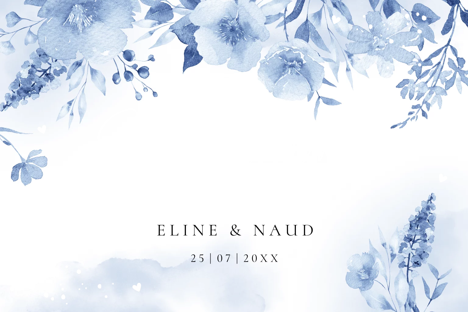 Stijlvolle Save the Date uitnodiging met watercolour bloemen blauw en goudfolie. Op de achterkant is ruimte voor een foto. Maak jullie trouwdatum bekend met deze trendy save the date!