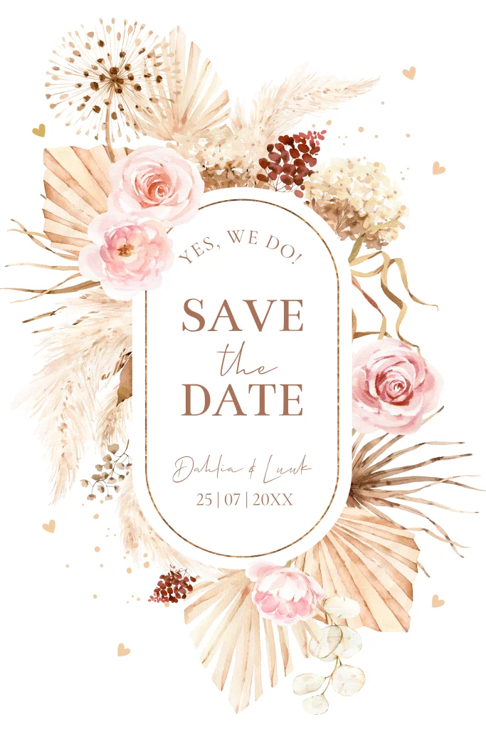 Save the Date kaart bohemian boho bloemen beige roze. Maak jullie trouwdatum bekend met deze prachtige bohemian stijl Save the date uitnodiging!