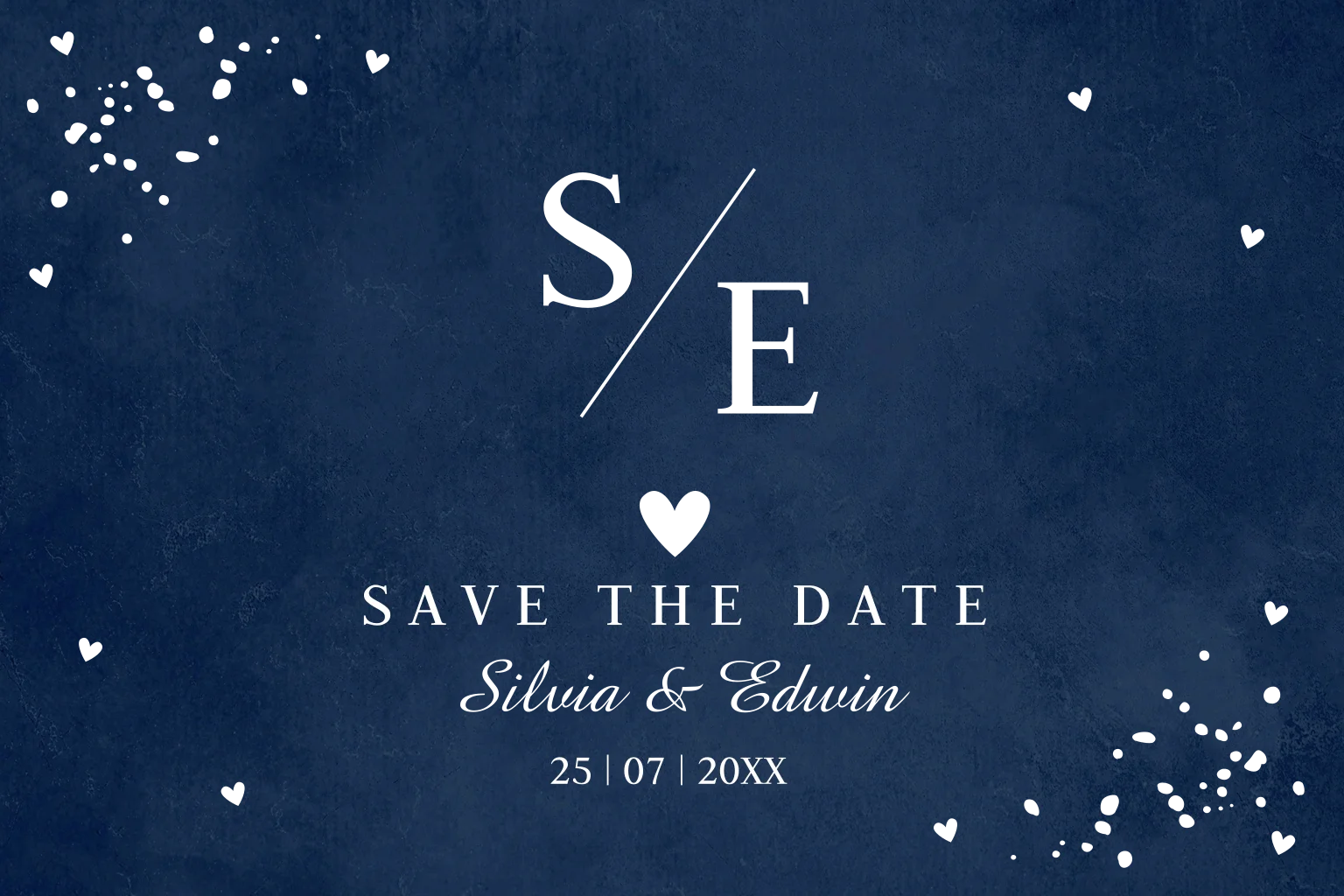 Save the Date kaart donkerblauw initialen naam goudfolie