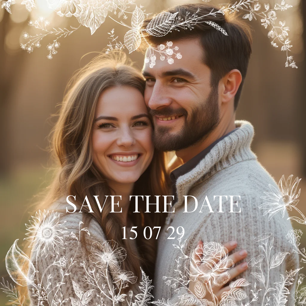 Save the Date kaart eigen foto bloemen wit goudfolie