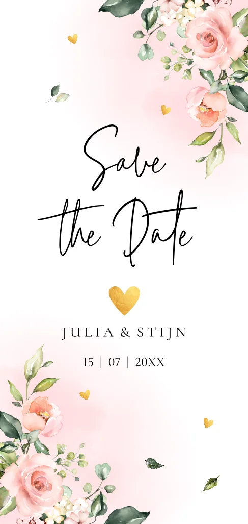 Prachtige Save the Date kaart langwerpig met roze bloemen. Stuur deze mooie Save the Date kaart naar jullie gasten om de trouwdatum bekend te maken.