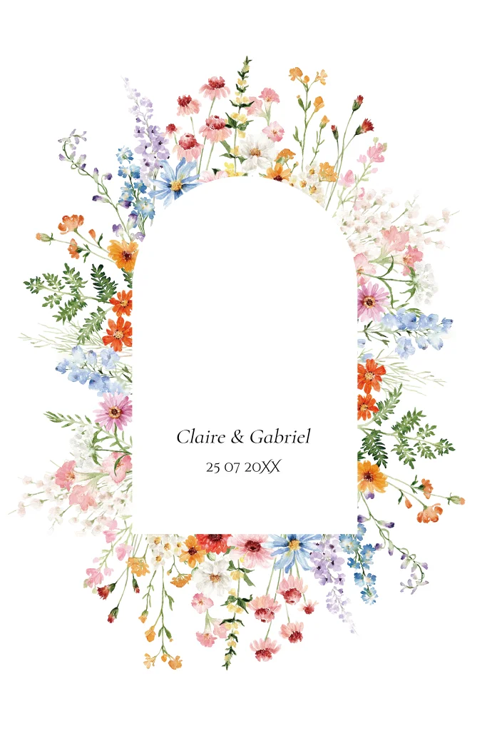 Save the Date kaart met mooie gekleurde bloemen krans in boog vorm en goudfolie. Maak jullie trouwdatum bekend met deze prachtige Save the Date uitnodiging.