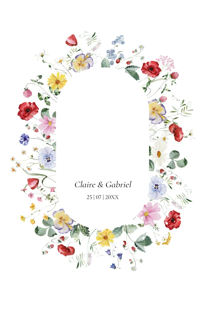 Save the Date kaart met mooie gekleurde bloemen in ovaal vorm en goudfolie. Maak jullie trouwdatum bekend met deze prachtige Save the Date uitnodiging.