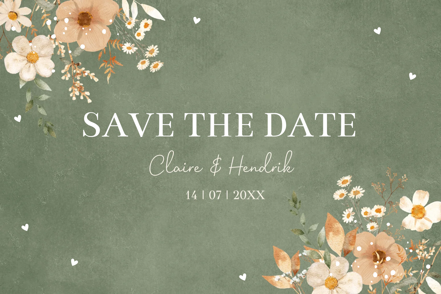 Save the Date kaart met watercolour bloemen in beige kleuren. Nodig jullie gasten uit met deze romantische save the date uitnodiging!
