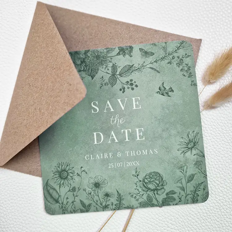 Stijlvolle Save the Date kaart groen met botanische bladeren en bloemen. Stuur deze mooie Save the Date kaart naar jullie gasten om de trouwdatum bekend te maken.