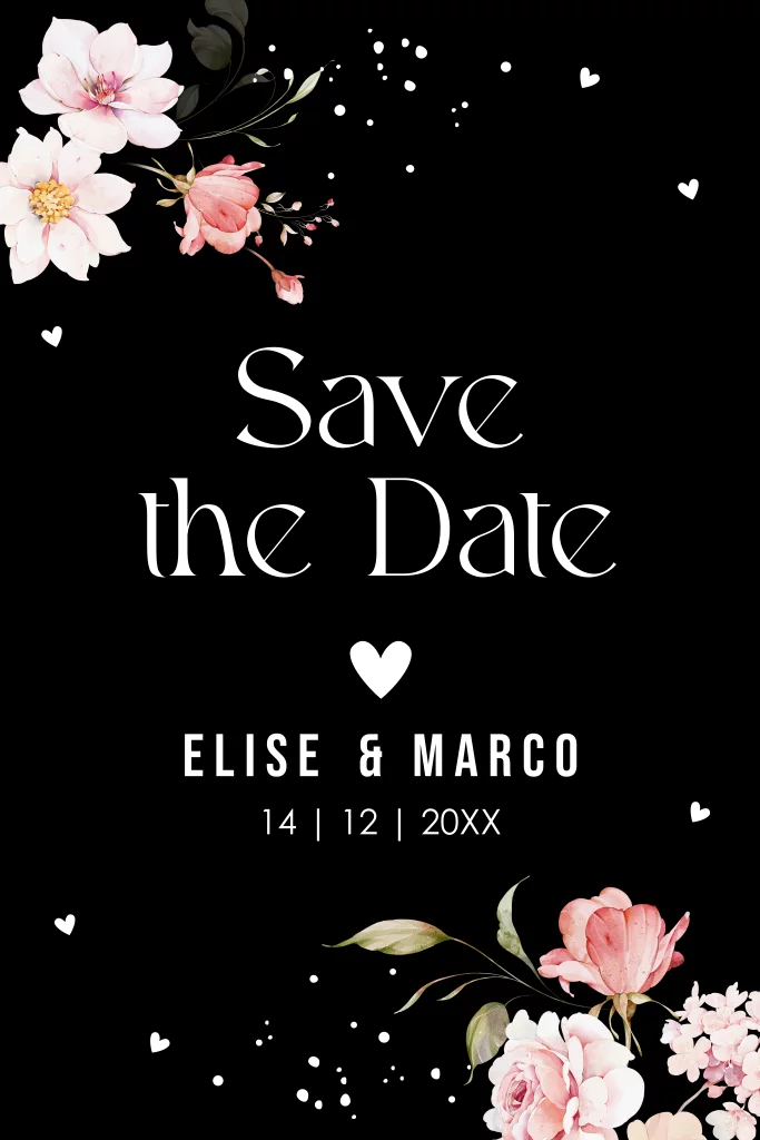 Romantische Save the Date uitnodiging zwart met mooie roze bloemen en rosegoudfolie.