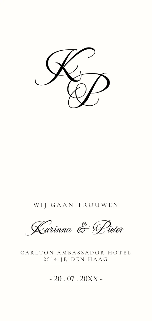 Trouwkaart zwart wit langwerpig chique initialen naam sierlijk