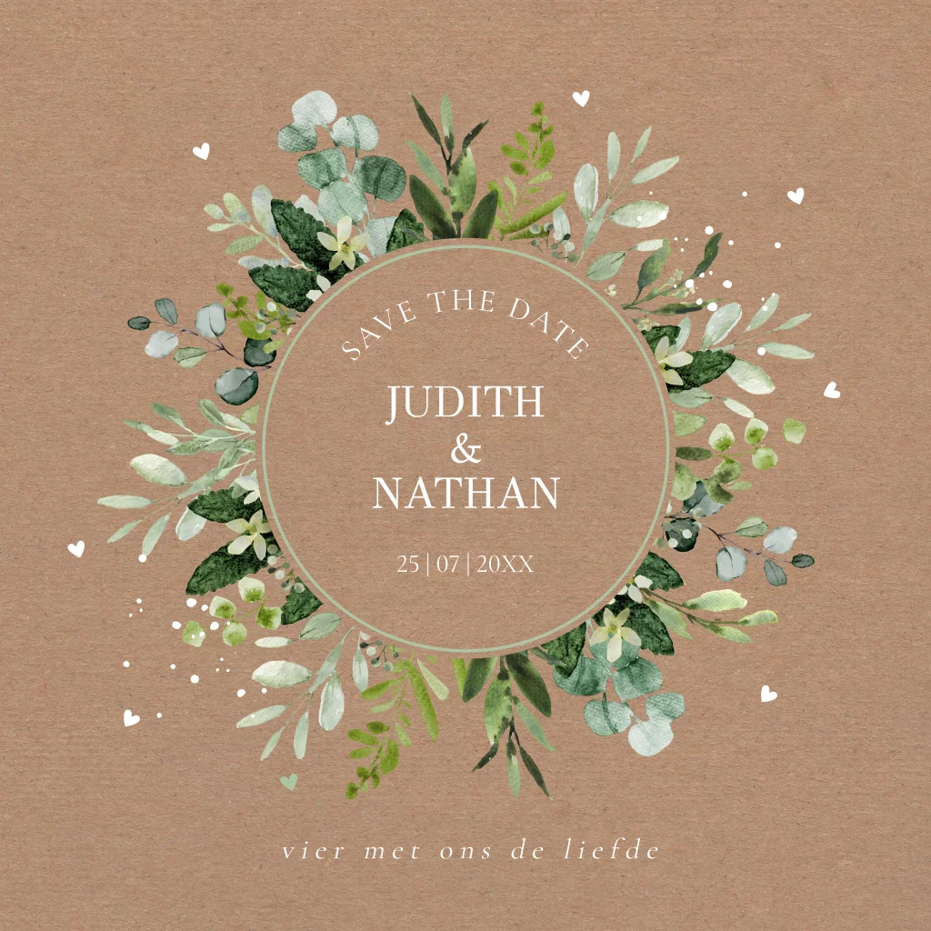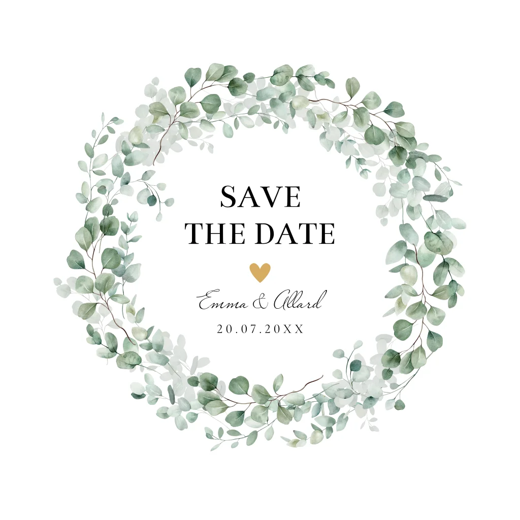 Stijlvolle Save the Date uitnodiging met krans van bladeren groen. Maak jullie trouwdatum bekend met deze prachtige save the date!