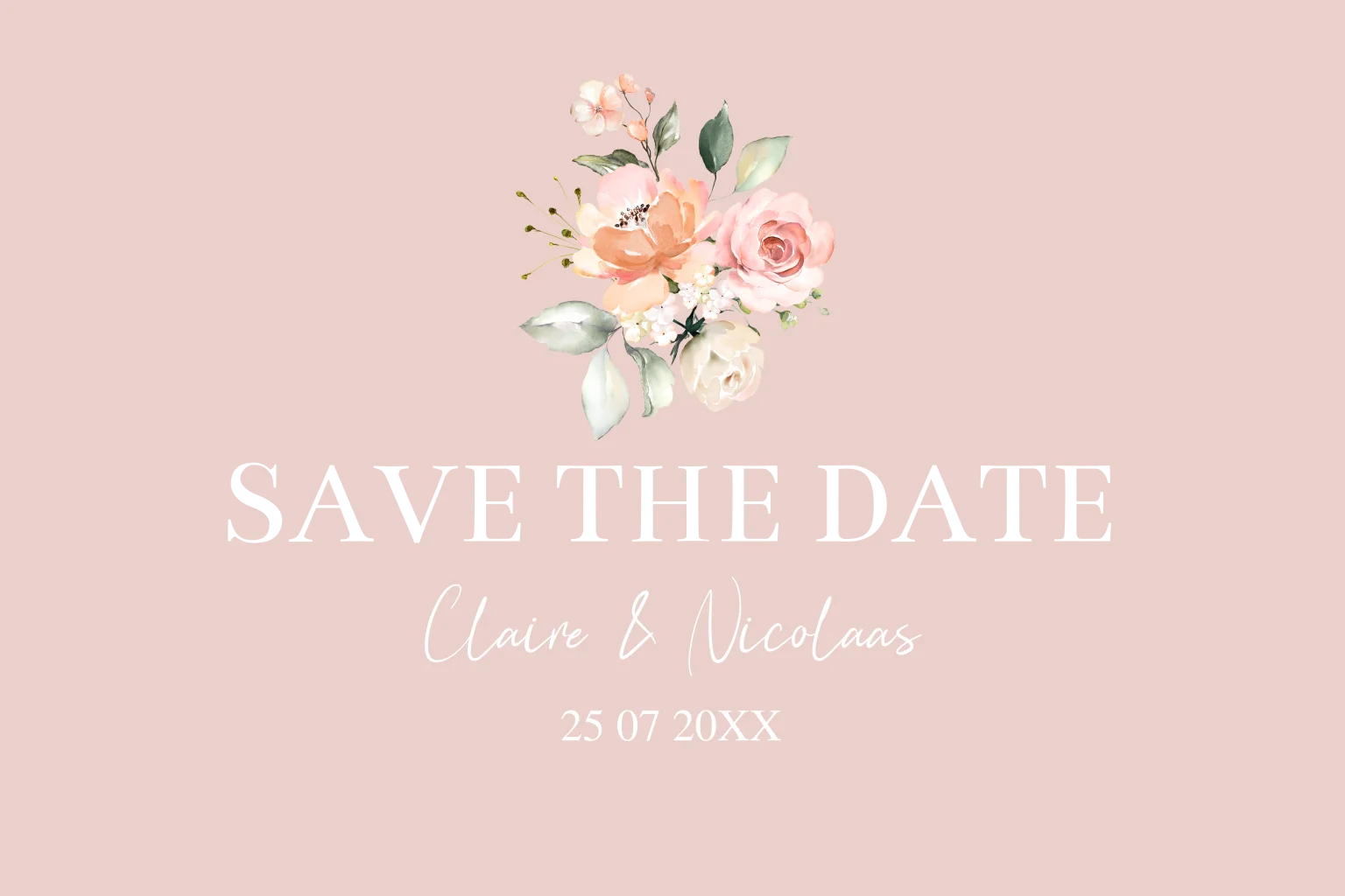 Stijlvolle Save the Date uitnodiging roze met bloemenboeket en luxe goudfolie. Maak jullie trouwdatum bekend met deze trendy Save the Date!