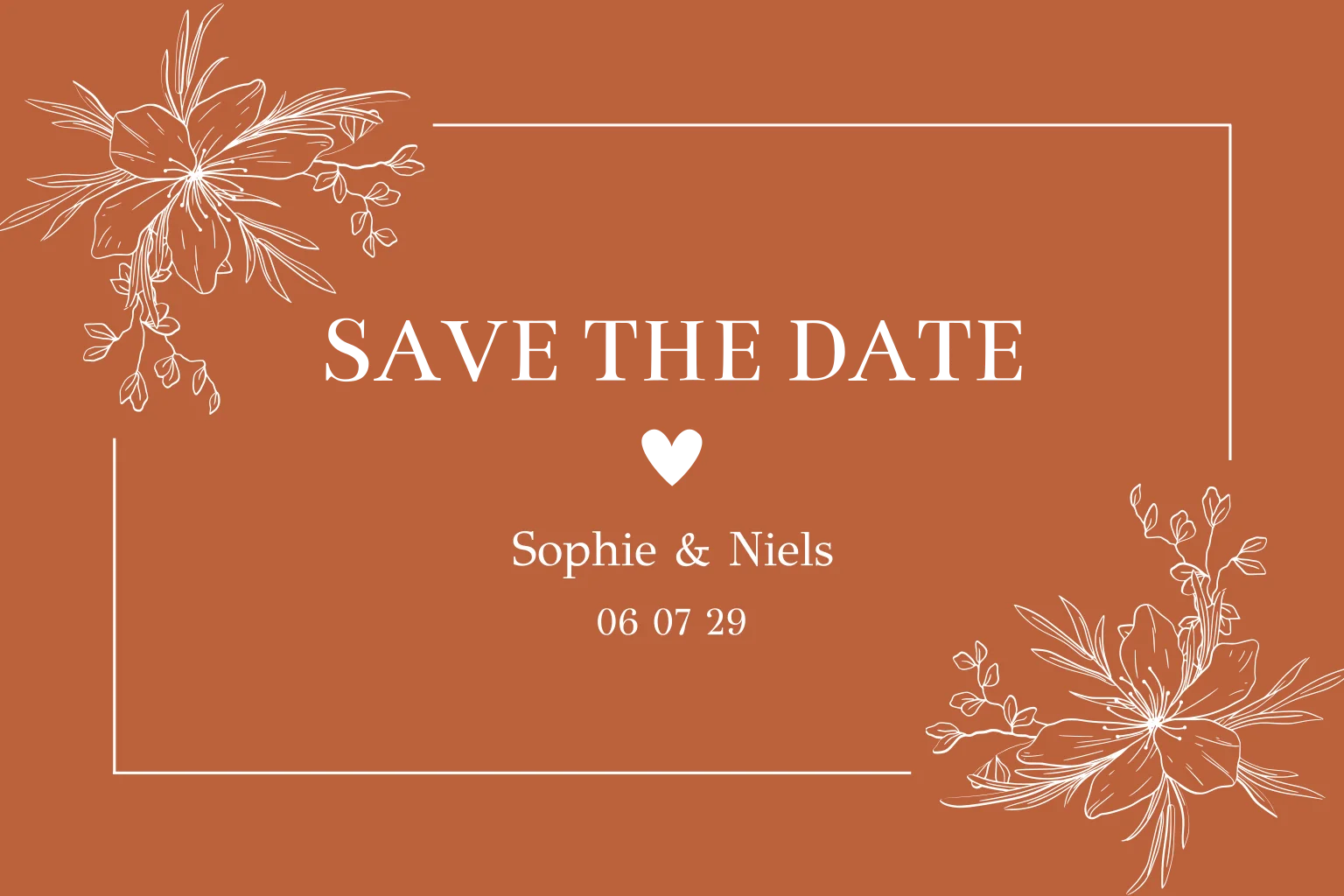 Stijlvolle originele Save the date uitnodiging roestbruin met bloemen frame en goudfolie. Maak jullie trouwdatum bekend met deze prachtige save the date!