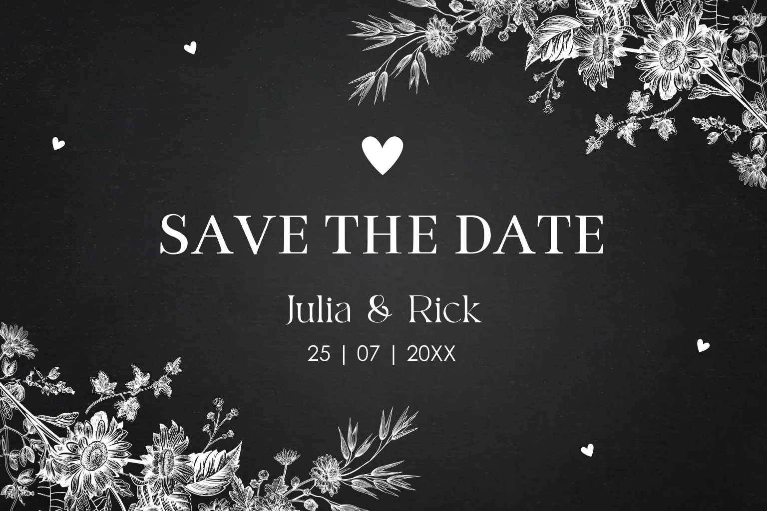 Save the Date kaart huwelijk zwart botanisch bloemen wit goudfolie. Maak jullie trouwdatum bekend met deze prachtige originele Save the Date!