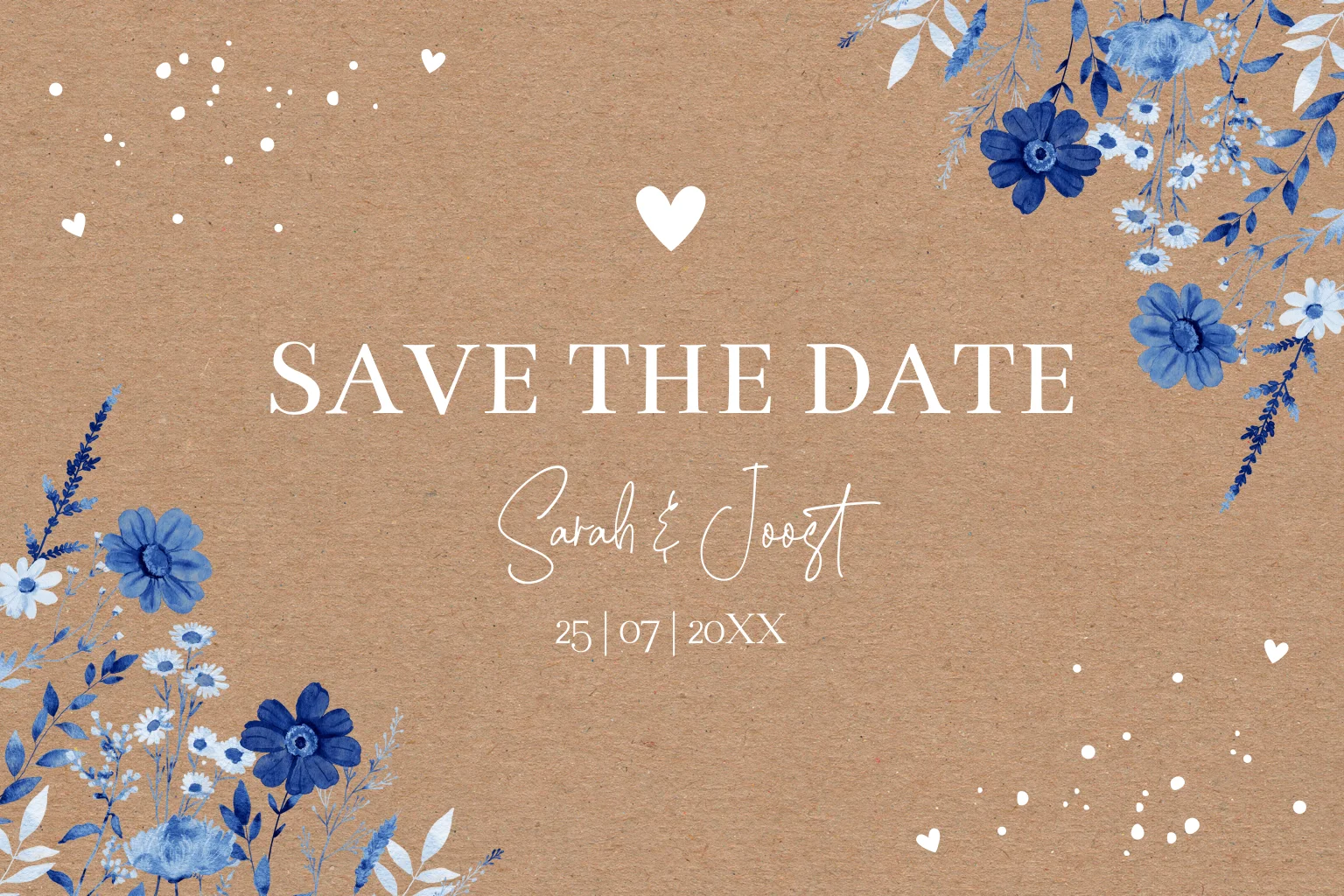 Save the Date kaart met kraftlook en bloemen blauw. Nodig jullie gasten uit met deze romantische save the date uitnodiging!