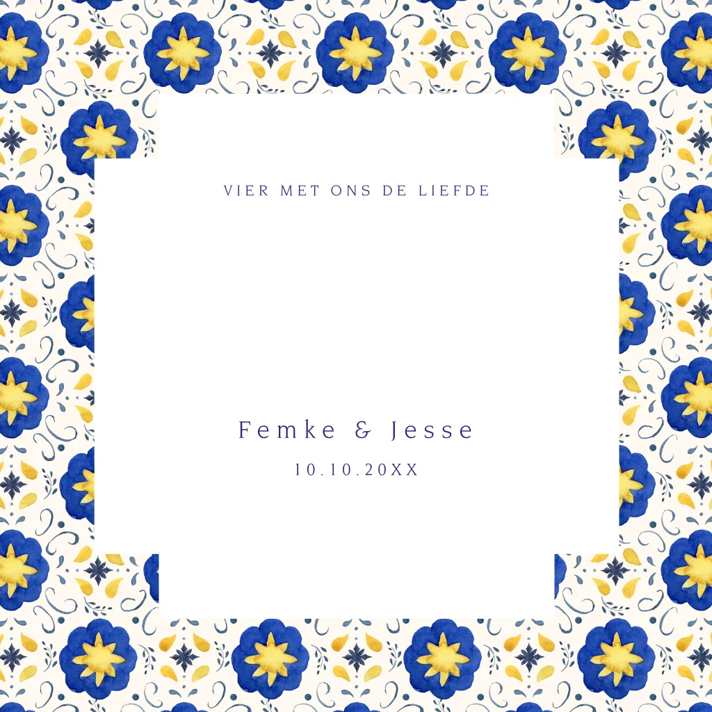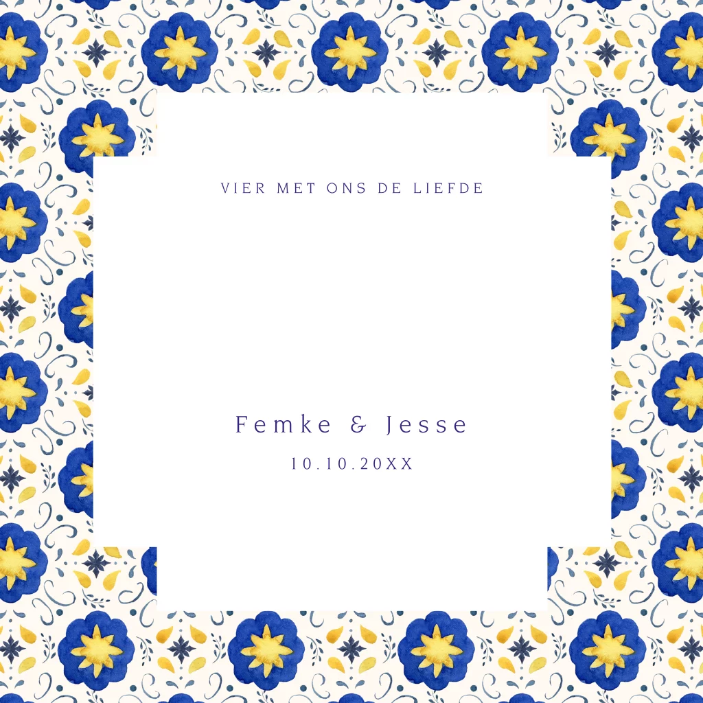 Prachtige Save the Date kaart met mediterraans patroon blauw geel. Deze exclusieve save the date uitnodiging wordt bedrukt met jullie namen en kader, trouwringen in goudfolie. Personaliseer de kaart naar eigen smaak met behulp van onze handige editor.