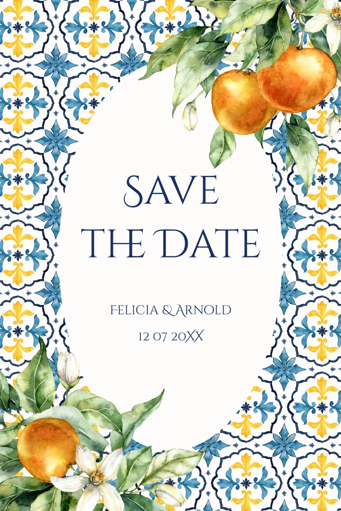 Save the Date kaart met Mediterraans patroon blauw en sinaasappels oranje. Maak jullie trouwdatum bekend met deze stijlvolle Save the Date uitnodiging