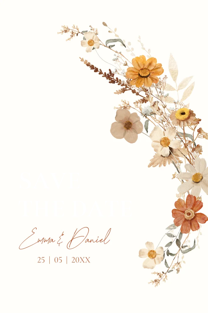Save the Date kaart met bloemen boeket en goudfolie. Maak jullie trouwdatum bekend met deze stijlvolle Save the Date uitnodiging