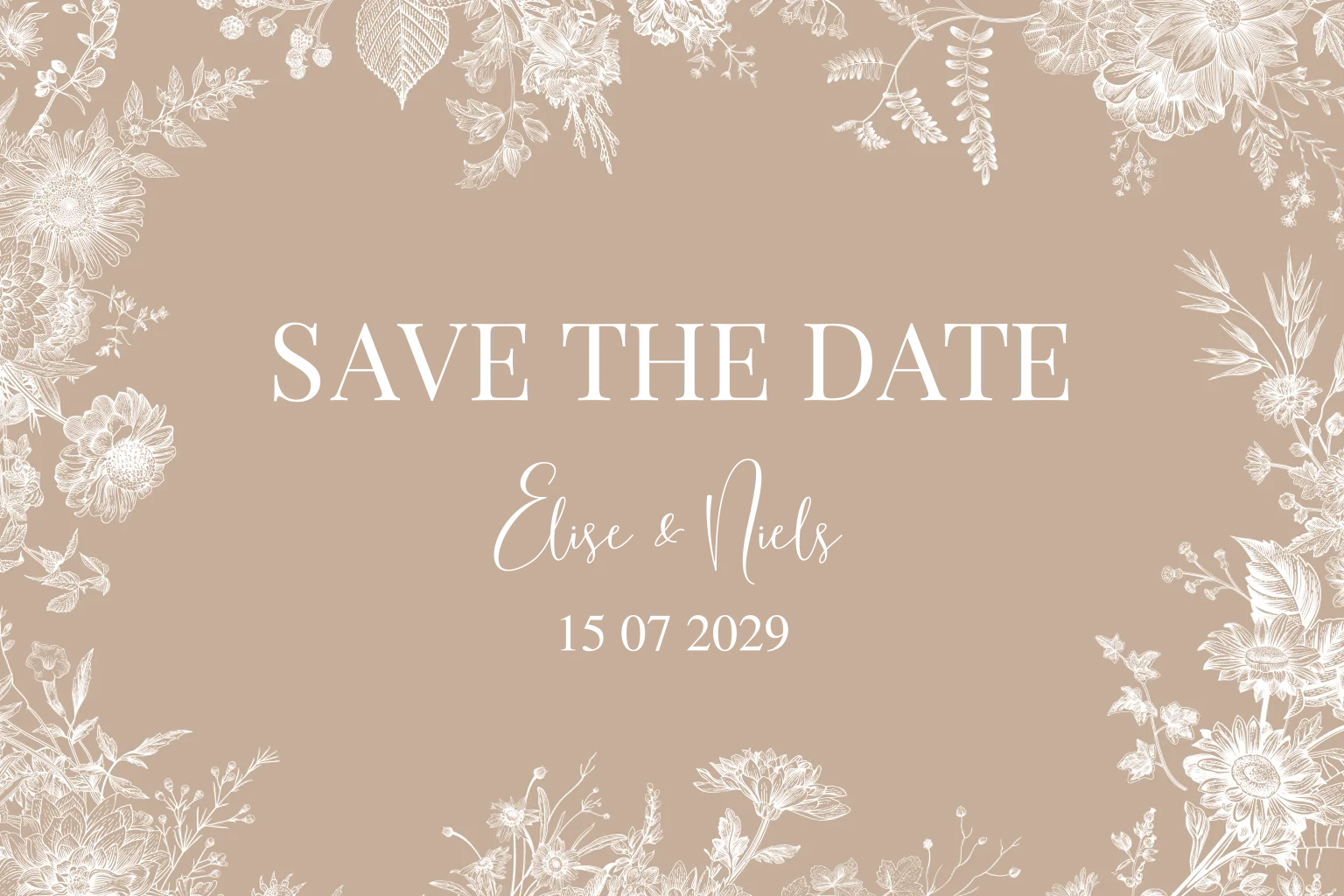 Stijlvolle originele Save the Date kaart huwelijk beige met bloemen kader en luxe goudfolie. Vier de liefde met deze prachtige Save the Date uitnodiging!