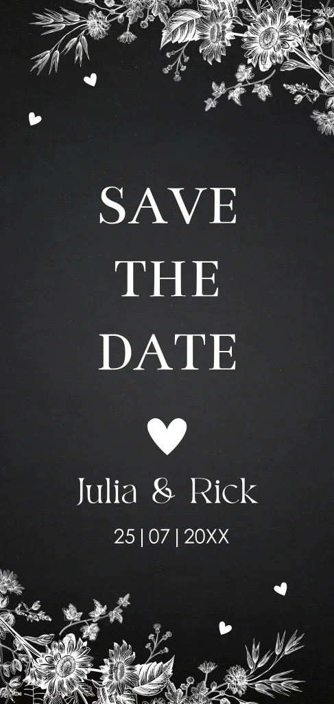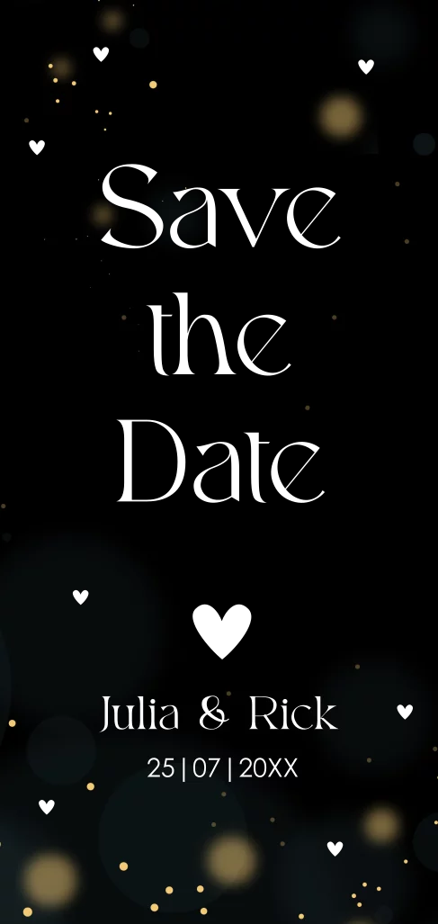 Save the Date uitnodiging langwerpig zwart met goudfolie.