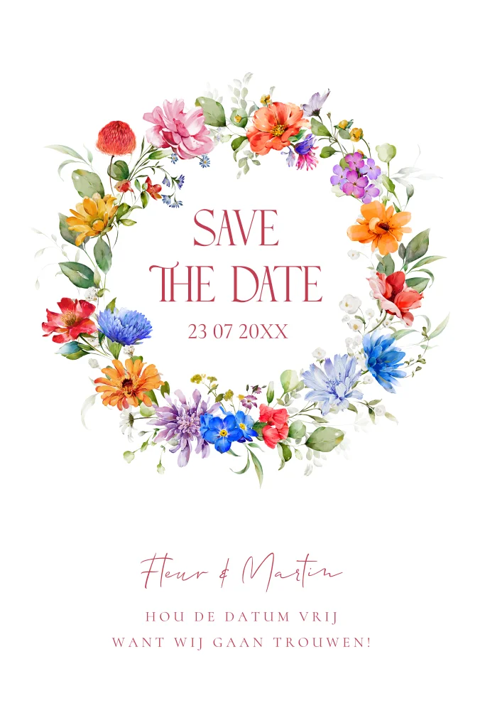 Save the Date uitnodiging met kleurrijke bloemenkrans. Maak jullie trouwdatum bekend met deze romantische save the date!